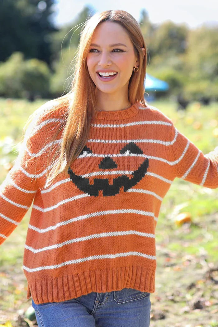 This must-have striped boyfriend sweater is crafted from Wooden Ships super soft wool blend with a relaxed, flattering fit that keeps you cozy all season long. The Jack-O-Lantern graphic is knit directly into the center front, adding a festive touch. Finished with ribbed crewneck, cuffs, and hem, plus small side slits for extra comfort and ease of movement. Whether you’re heading to a pumpkin patch, handing out candy, or enjoying a crisp autumn walk, this sweater is equal parts adorable and comfy—perfect for adding a little Halloween fun to your fall wardrobe.